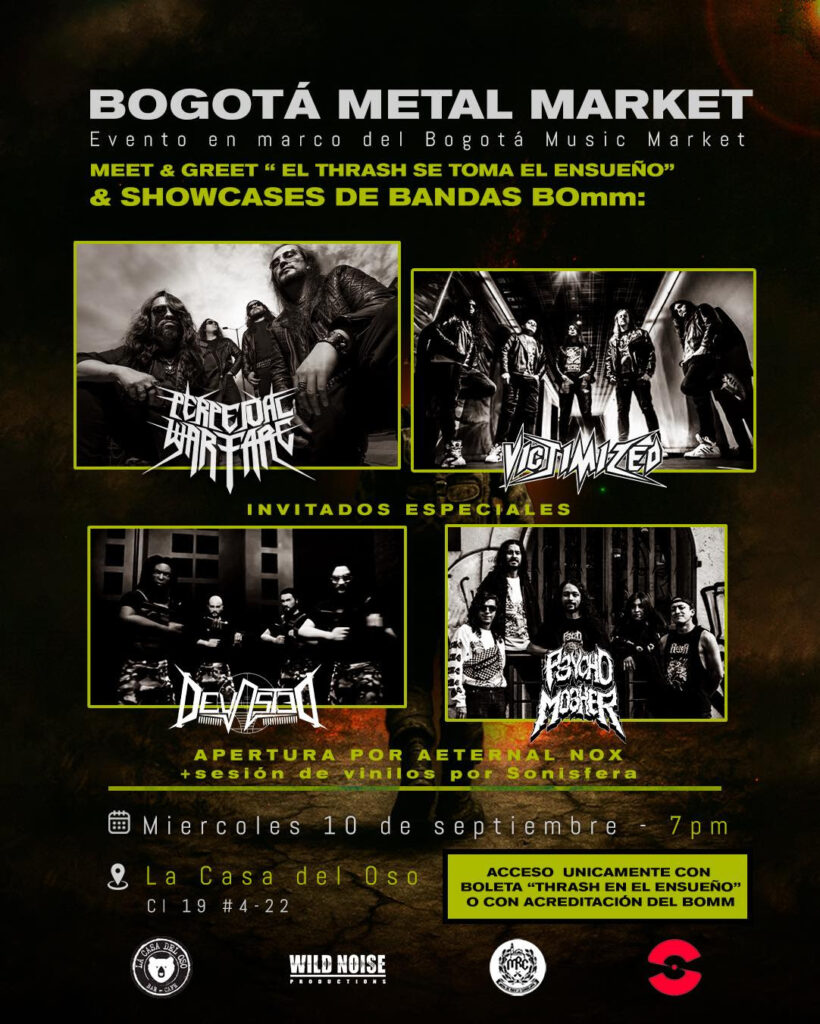 El metal colombiano será protagonista con una velada dedicada al thrash metal capitalino. El miércoles 10 de septiembre a partir de las 7:00 p.m. el público podrá disfrutar con los showcases de bandas que toman parte en la edición 2025 de este mercado: Perpetual Warfare, Victimized, Devasted, Psycho Mosher y Aeternal Nox.